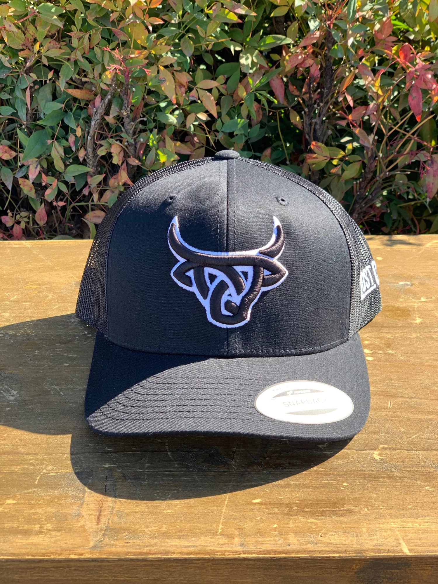 Baseball cap with Lost Calf logo embroidered on front in black with , Lost Calf stitched on left side. Snap back – one size fits all.