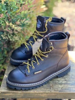 Georgia Waterproof Lace-To-Toe Boots are comfortable, quality boots with waterproof protection; a great choice for work or hanging out. These men’s work boots are made with the Georgia waterproof system. Your feet are guaranteed to stay dry throughout the day despite encounters with puddles, mud or rain. So go ahead and walk where you want, Georgia Boot has your feet covered. Georgia boots last a long time, too. Made of quality full-grain leather that’s going to hold up over time, the genuine Goodyear welt construction also is used for durability. The outsoles are tough as well because the outsole is abrasion-resistant and oil-resistant. Comfort features include a full lining and a covered cushion insole, while a steel shank provides foot support. The brown leather of these six-inch boots looks great and is topped off with quality brass hardware and a removable brush guard kiltie. If you’re looking for durable waterproof work boots, or just boot to kick around in, check out these lace-to-toe boots from Georgia Boot.