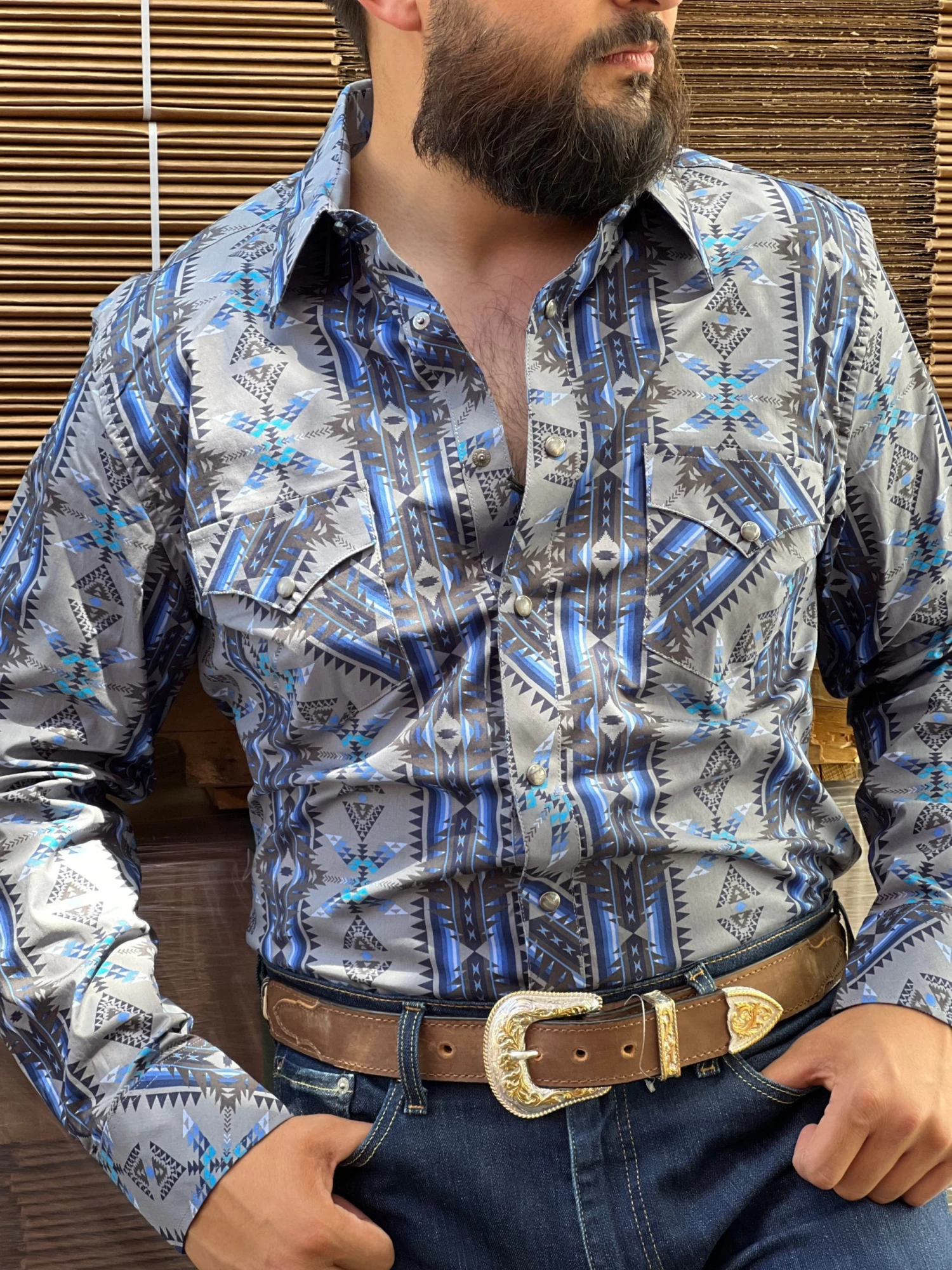 Rock And Roll Blue Aztec Snap Long Sleeve Shirt