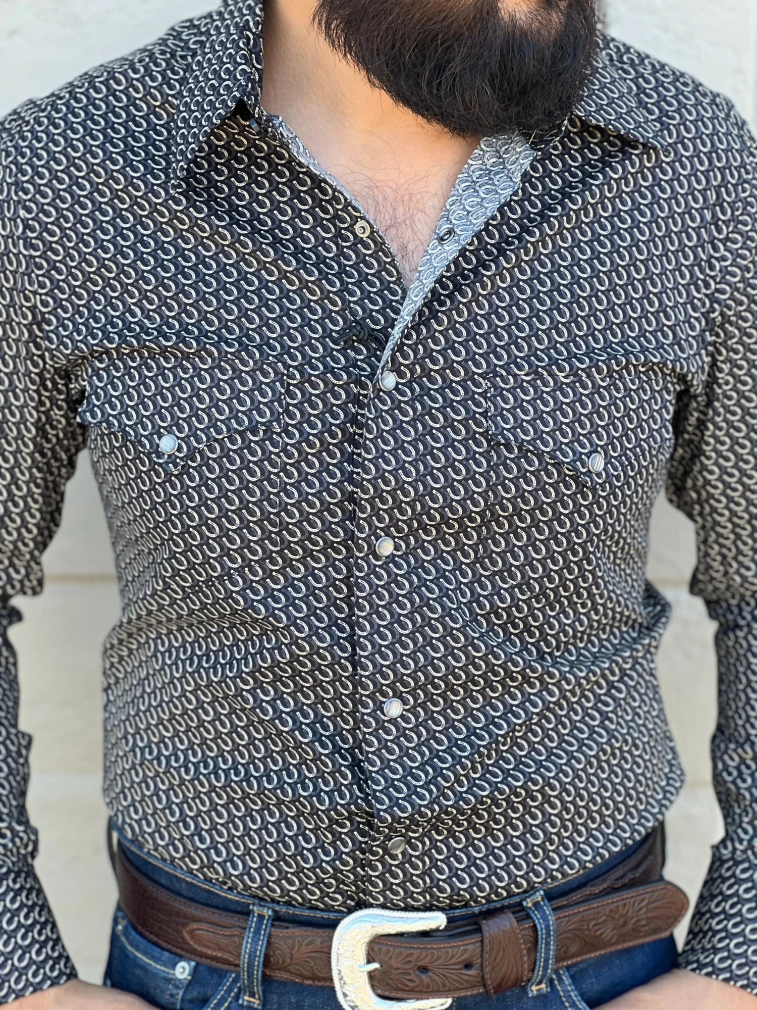 Rock And Roll Horseshoe Print Snap Long Sleeve Shirt